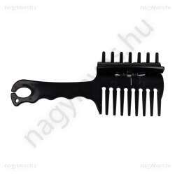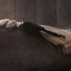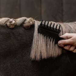A klipszel ellátott sörényfésű lehetővé teszi a szoros fonást. Lovad sörénye a klipszel van rögzítve, a fésű pedig biztosítja, hogy egyenletes metszeteket készíthess. A fésű fogantyújában van egy szem, amelyre felakaszthatja gumiszalagjait.