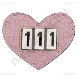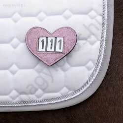 A szív alakú számtartót finoman csillámpor díszíti. Ez a számtartó könnyen rögzíthető a kantárhoz vagy a nyeregalátéthez biztosítótűvel vagy tépőzárral. Cserélhető számok mellékelve.