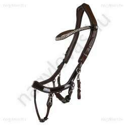 A kantár lakkbőr orrszíjjal és strasszokkal díszített homlokszíjjal készült.