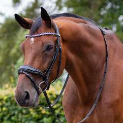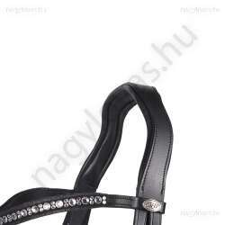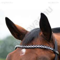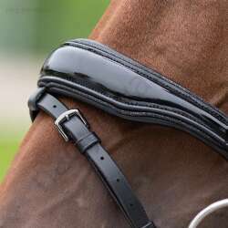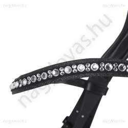 Ez az elegáns, lakkbőr orrszíjjal ellátott kantár az elegancia és a kényelem tökéletes kombinációja. A homlokszíjat strassz borítja, amelyek gyönyörűen csillognak. Az anatómiailag kialakított fejrésznek és a puha párnázott orrpántnak köszönhetően a kantárt nagyon kényelmes viselni. A lakkbőr orrszíj körüli csillogó szegély teszi teljessé az elegáns megjelenést.