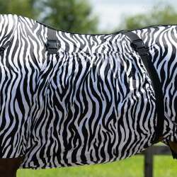 Ez az ekcéma takaró rögzített nyakrészt tartalmaz rugalmas záródással, széles hasvédőt rugalmas, állítható hevederekkel és széles farokvédőt. A takaró műanyag záródású, és az első lábak között is található egy zár a hasvédő rögzítéséhez. Kutatások bizonyították, hogy a zebra minta a csíkok fényvisszaverődése miatt riasztja el a legyeket. Ez a visszaverődés irritálja a rovarokat.