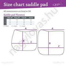 Elegáns nyeregalátét két díszítő zsinórral, színes szegéllyel és anatómiailag formázott háttal. A nyeregpárna hevederhurokkal és rövid nyereghurokkal van ellátva Hook-and-loop rögzítővel, amelyek biztosítják, hogy a nyeregpárna a helyén maradjon. A háton található QHP hímzés teszi teljessé a nyeregpárnát.