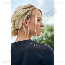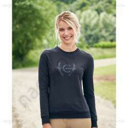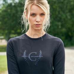 Puha és légáteresztő pamut pulóver mindennapi viselethez az istállóban. A sztreccs anyag megkönnyíti a mozgást, a mellkason lévő flitterek pedig csillogást kölcsönöznek lovaglószekrényének.