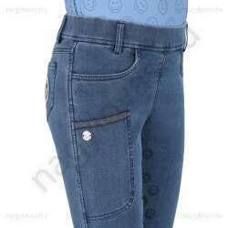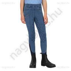 Ez a farmer lovaglóleggings puha, rugalmas anyagból készült, és kényelmes viseletet biztosít lovaglás közben. A hátsó zseben található mosolygós folt játékos részletet kölcsönöz. A teljes fogású ülép apró mosolygós mintákkal van ellátva, és jó fogást biztosít a nyeregben. A jobb száron található egy zseb, amely például egy telefonnak is elfér. A zseb széle csillámos anyaggal és tűgombolóval van ellátva. A leggings rugalmas szárvégekkel és övbújtatós derékpánttal rendelkezik.