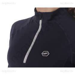 Sportos sportpóló, amely a gyorsan száradó és légáteresztő anyagnak köszönhetően tökéletes edzéshez. A póló rugalmas anyagból készült az optimális mozgásszabadság érdekében. A gallér cipzárja mögött "Equestrian Sports" felirattal. A bal mellkason logós jelvénnyel díszített.