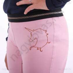 Szemet gyönyörködtető lovaglóharisnya nagyon rugalmas anyagból, amely puha tapintású. Csillámokkal ellátott rugalmas derékpánttal ellátott. Egyszarvú nyomtatás a bal első oldalon.