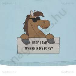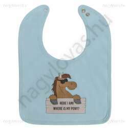 Bobby bodyhoz illő előke. Az előke tetején ez a felirat látható: „Itt vagyok! Hol van a pónim?” Az előke szárazon tartja a baba ruháit.