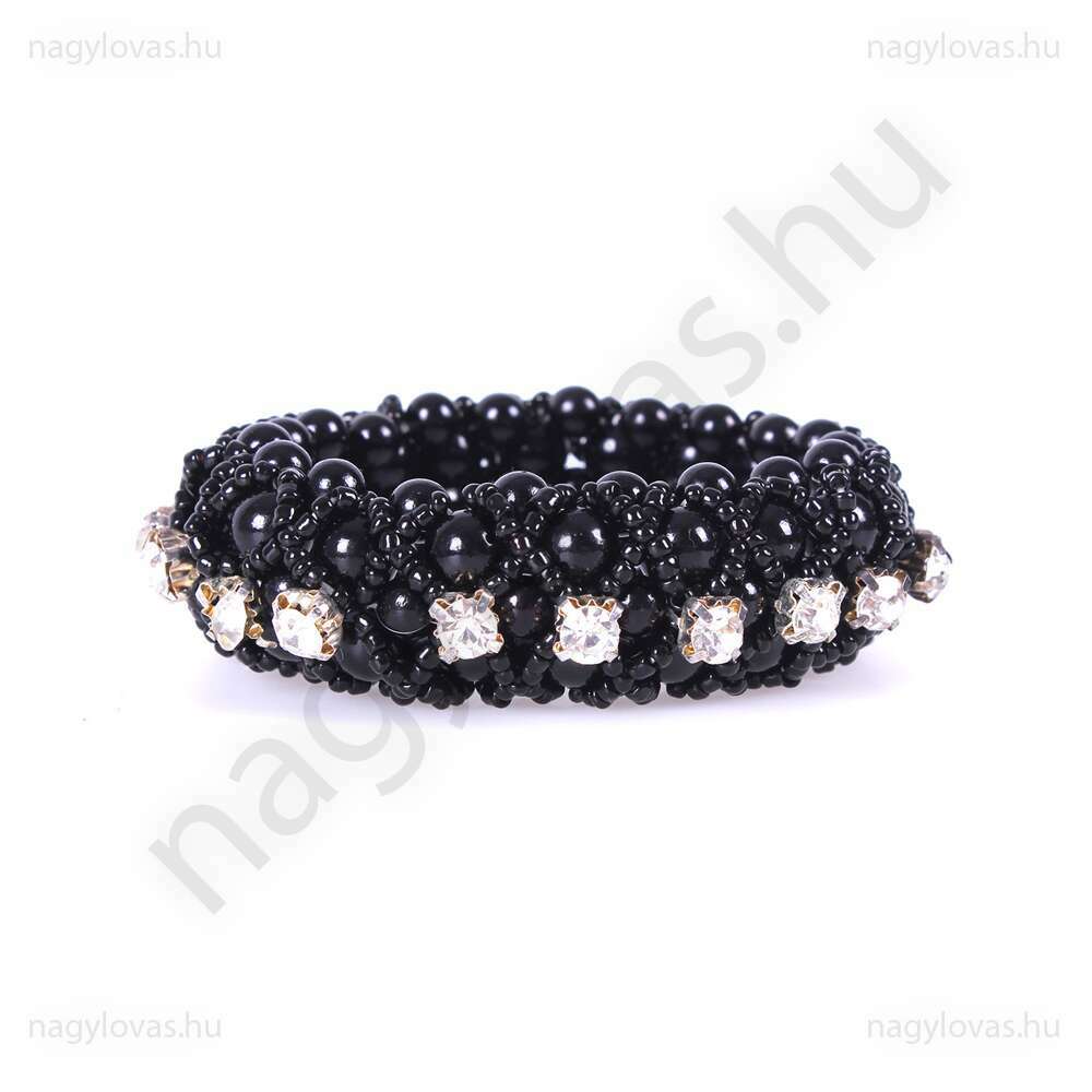 Elasztikus hajgumi sok különböző méretű gyöngyökkel, nagy ezüst strasszokkal.