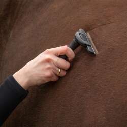 Használat után a kefét a tetején található gomb megnyomásával könnyen eltávolíthatja, majd megtisztíthatja. Praktikus kefe ló szőrzetének ápolásához!
