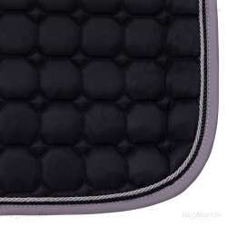 Elegáns nyeregalátét két díszzsinórral, színes szegéllyel és anatómiailag formázott hátrésszel. A nyeregalátét hevederhurkokkal és tépőzáras rövid hurkokkal rendelkezik, hogy a nyeregvédő a helyén maradjon. A hátoldalon található QHP hímzés teszi teljessé a megjelenést.