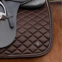 Elegáns, kiváló minőségű nyeregbetét fényes anyagból. Különleges részlet a két díszzsinór között csillogó strassz szalag. A logó ezüst színű fémlemez formájában jelenik meg. Nepál kollekciónkhoz illő.