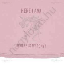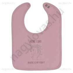 Bobby bodyhoz illő előke. Az előke tetején ez a felirat látható: „Itt vagyok! Hol van a pónim?” Az előke szárazon tartja a baba ruháit.
