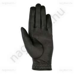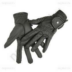 Légáteresztő női lovaglókesztyű műbőrből. A biztos illeszkedés érdekében a kesztyűt patental rögzíthető, és rugalmas csuklópánttal rendelkezik.