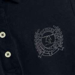 Elegáns, rövid ujjú póló elöl gombos, gallérján strasszcsíkkal, TH logó és csillogó strasszokból kirakott ló a bal mellkason.